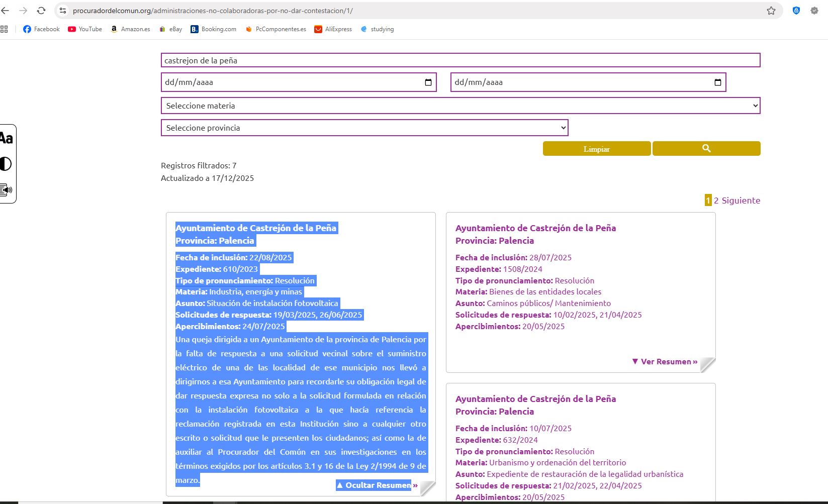 La situación extendida de falta de respuesta municipal también fue objeto de un pronunciamiento por parte del Procurador del Común de Castilla y León, que en su expediente 610/2023 incluyó al Ayuntamiento de Castrejón de la Peña en el Registro de Entidades No Colaboradoras por no responder a solicitudes sobre la situación de la instalación fotovoltaica de Boedo.