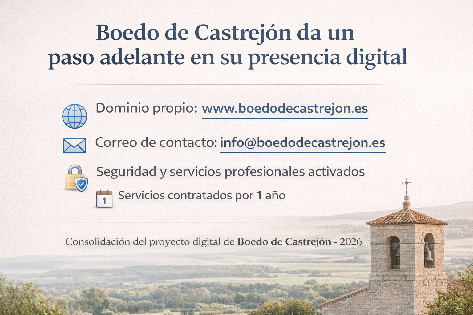 En los últimos días, la web de Boedo de Castrejón ha dado un paso importante en su proceso de consolidación como espacio de información, memoria y seguimiento de la evolución del pueblo, con la activación del dominio propio www.boedodecastrejon.es y la puesta en marcha de servicios digitales asociados.