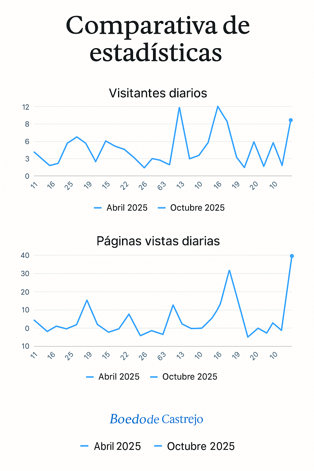 La página web de Boedo de Castrejón continúa creciendo poco a poco, con un aumento sostenido en las visitas y páginas vistas durante el último mes.
